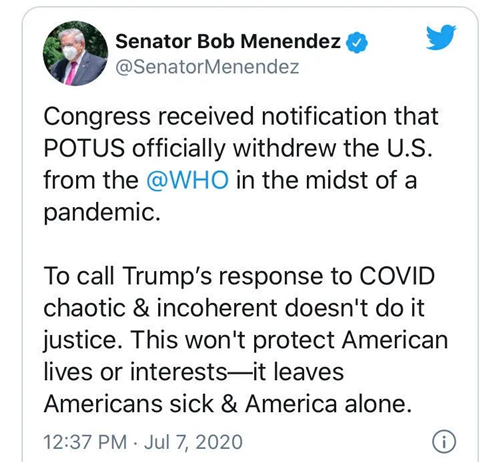 “國(guó)會(huì)收到通知,美國(guó)總統(tǒng)在全球疫情大流行期間,正式將美國(guó)從世衛(wèi)組織中撤出。”美國(guó)國(guó)會(huì)參議院外交關(guān)系委員會(huì)成員羅伯特·梅嫩德斯7月7日則稱,特朗普在新冠疫情應(yīng)對(duì)中表現(xiàn)出“混亂和前后不一”,退出世衛(wèi)組織的舉動(dòng)“不會(huì)保護(hù)美國(guó)人民的生命或利益,而是使美國(guó)人生病,使美國(guó)孤立無援”。