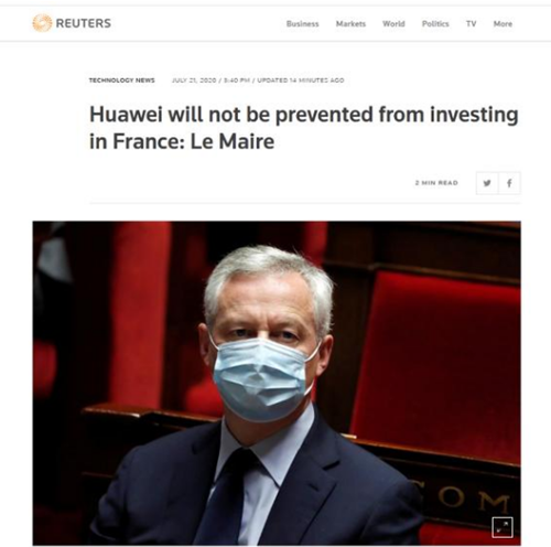 英國上周宣布將禁用華為后,其他歐洲國家對待華為的態(tài)度也受到關(guān)注。路透社21日最新消息說,法國財政部長勒梅爾當天表示,法國不會禁止華為在法投資5G。