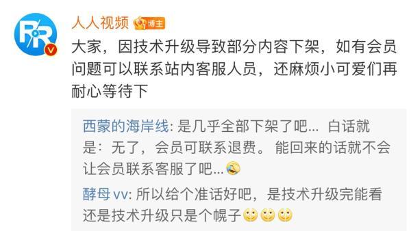 對此,人人視頻官方賬號在微博平臺回應稱,“因技術升級導致部分內(nèi)容下架,如有會員問題可以聯(lián)系站內(nèi)客服人員,還麻煩小可愛們再耐心等待下”。