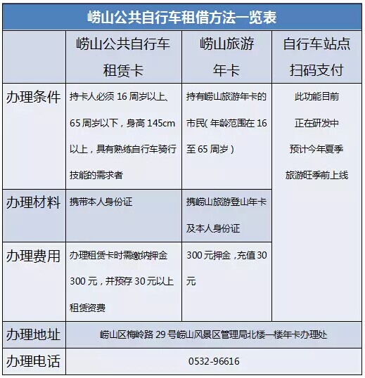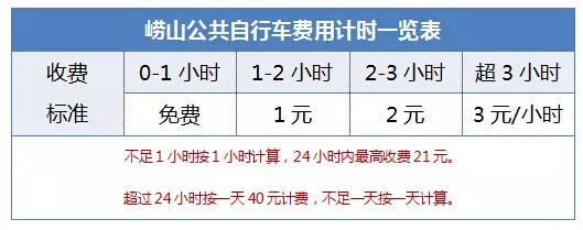 注:持嶗山登山年卡的市民,在辦理并預(yù)存過金額之后,使用公共自行車時可享受5小時內(nèi)免費的優(yōu)惠政策,5小時后,按普通自行車租賃卡的收費標準計費。