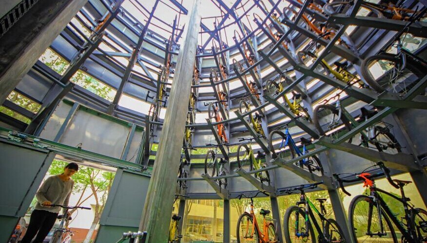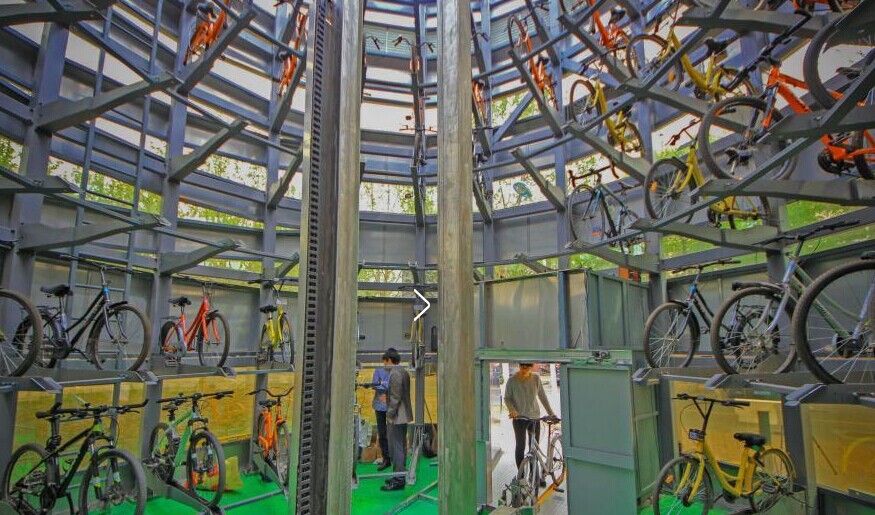 據(jù)了解,該存車樓主體為高8米,直徑8米的圓筒狀鋼結(jié)構(gòu),可存放120輛20-26英寸的自行車,通過刷身份證、學生卡可將自行車快速便捷的存放在車庫內(nèi)。