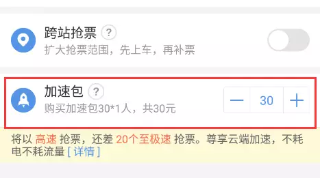 加速包有1元每個(gè)的,也有10元、20元、50元等分檔的,你可以自行選擇一次性購買的數(shù)量,購買的越多,顯示搶票成功的幾率就越大。除了加速包,還有成為VIP的選項(xiàng),收費(fèi)最貴為50元/年。
