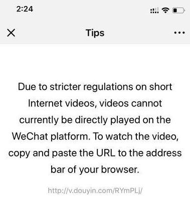 目前目前微信已經(jīng)開放快手、微視的視頻分享到微信,但頭條系視頻產(chǎn)品如抖音、火山目前仍顯示因互聯(lián)網(wǎng)整治無法分享。另外,還有網(wǎng)友爆料稱,微信對(duì)抖音的封殺已經(jīng)擴(kuò)展到海外市場(chǎng),海外用戶在微信上分享抖音會(huì)看到英文提示。