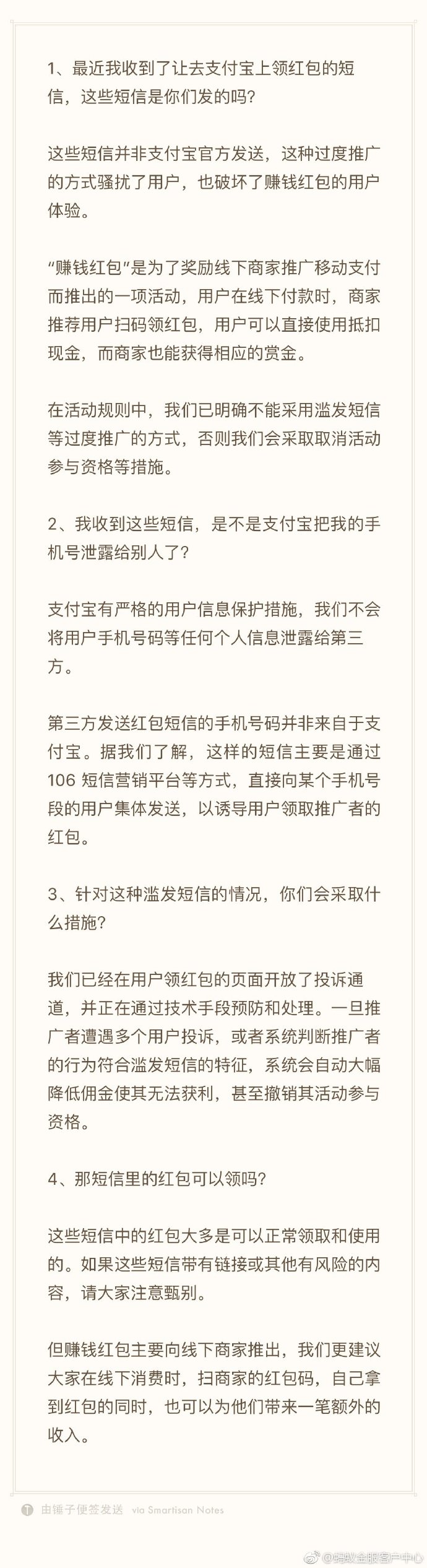 進(jìn)入12月份,支付寶推出了用支付寶到店付款15天瓜分15億活動(dòng),于是新一輪的掃碼領(lǐng)紅包襲來(lái)。這兩天,一些用戶反映稱,收到了邀請(qǐng)領(lǐng)取支付寶紅包的短信。支付寶官方今天表示:“此類短信不是支付寶官方發(fā)送的,支付寶已采取技術(shù)手段嚴(yán)厲打擊此類行為,也歡迎廣大用戶向我們舉報(bào)。”