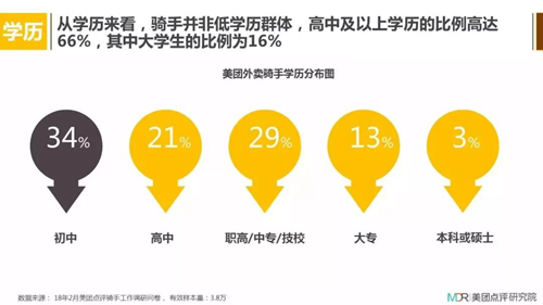 從美團(tuán)點(diǎn)評(píng)研究院發(fā)布的《2018年外賣騎手群體研究報(bào)告》中我們可以看到,從事騎手職業(yè)的人通常來自小城市且文化水平偏低,這就導(dǎo)致騎手在與消費(fèi)者交流中常因?yàn)槿狈贤记僧a(chǎn)生爭(zhēng)執(zhí)。也親眼見過騎手去咖啡店取餐,因?yàn)閷?duì)咖啡不了解,普通話又不好,溝通浪費(fèi)了很長(zhǎng)時(shí)間,過程中遭店員頻繁白眼。