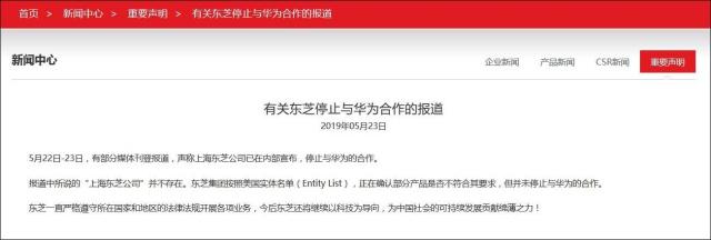 東芝中國官網23日發(fā)表一份聲明說,有部分媒體稱上海東芝公司已在內部宣布停止與華為的合作,但報道中所說的“上海東芝公司”并不存在。東芝集團“并未停止與華為的合作”。