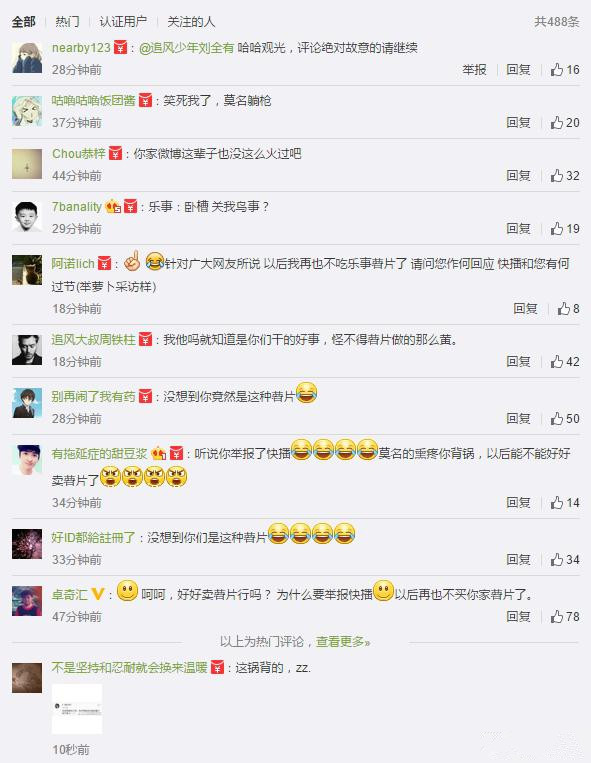 目前@樂事官方微博的評論中幾乎都是網(wǎng)友在吐槽舉報(bào)快播這回事兒,估計(jì)樂事自家的微博從來都沒有這么火爆過。