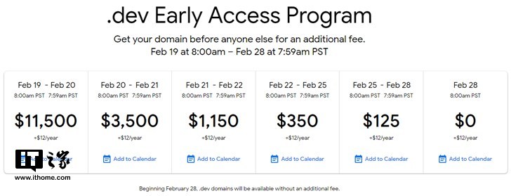 2月19日,谷歌開放公眾早期訪問階段,允許普通用戶進行注冊。自美國時間2月19日8:00到2月28日7:59期間內(nèi)注冊.dev頂級域名,需要向谷歌繳納不等的費用,美國時間2月28日之后,將免費開放注冊。